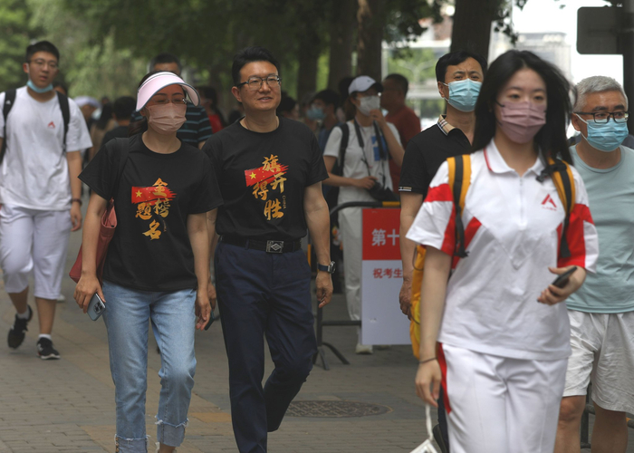 6月7日下午,人大附中考点,两位家长身穿“金榜题名、旗开得胜”的衣服,目送女儿进考场。