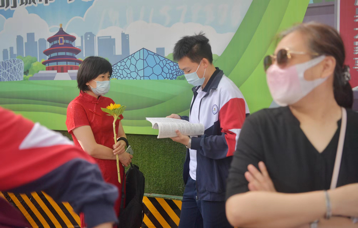 6月10日下午,通州区潞河中学,考生收到小朋友送上的鲜花。