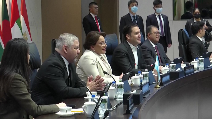 2023年6月10日,上海,洪都拉斯总统希奥玛拉·卡斯特罗抵达金砖国家新开发银行总部,开始此次访华之旅的首站行程。视觉中国 视频截图