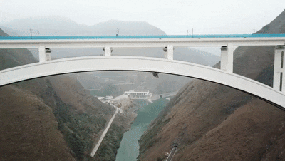 沪昆高铁北盘江特大桥,位于贵州省关岭布依族苗族自治县与晴隆县交界处,为上承式劲性骨架钢筋混凝土拱桥,大桥以一跨形式跨北盘江而过。大桥全长721米,其中主桥跨度445米,桥面距离北盘江江面约300米。