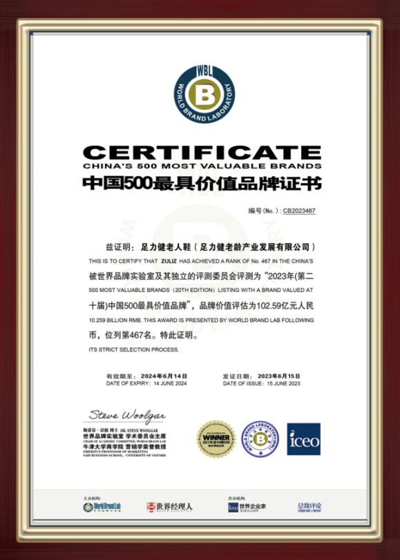 由世界品牌实验室(World Brand Lab)主办的(第二十届)“世界品牌大会”于6月15日在北京举行,会上发布了2023年《中国500最具价值品牌》分析报告。在这份基于财务数据、品牌强度和消费者行为分析的年度报告中,足力健老人鞋凭借102.59亿元品牌价值,成功入榜中国品牌500强名单。据悉,足力健老人鞋已连续两年入榜,排名相较去年提升7个名次,是本次入榜单位中唯一一家老龄行业品牌。