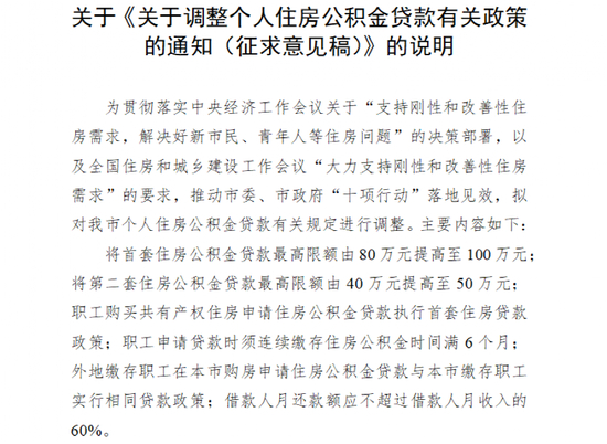 根据《关于调整个人住房公积金贷款有关政策的通知(征求意见稿)》,为贯彻落实中央经济工作会议关于“支持刚性和改善性住房需求,解决好新市民、青年人等住房问题”的决策部署,以及全国住房和城乡建设工作会议“大力支持刚性和改善性住房需求”的要求,推动市委、市政府“十项行动”落地见效,拟对天津市个人住房公积金贷款有关规定进行调整。主要内容如下:
