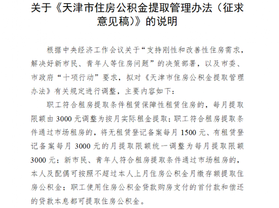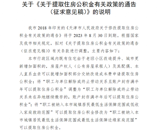 天津市2018年印发的《天津市人民政府关于修改提取住房公积金有关政策的通告》将于2023年8月30日到期。根据国家及天津市相关规定,拟对《关于提取住房公积金有关政策的通告(征求意见稿)》有关条款进行调整,主要内容如下: