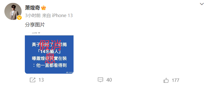 6月20日晚,网传黄子佼爆料演唱《你是我的眼》的萧煌奇并不是盲人,其实一直都看得到,还有网友爆料称曾看到萧煌奇自己开车。随后,萧煌奇在评论区辟谣:“这篇是假消息 ,请撤除哦。”