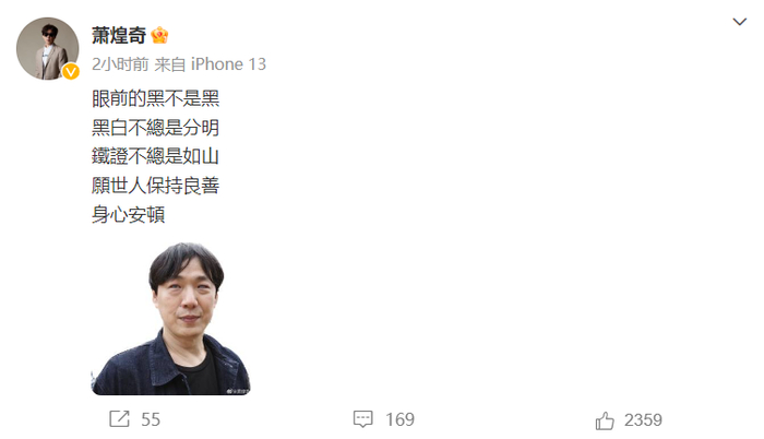 1小时后,萧煌奇在微博再次发文:“眼前的黑不是黑,黑白不总是分明,铁证不总是如山,愿世人保持良善,身心安顿”,并附上了自己的一张照片。