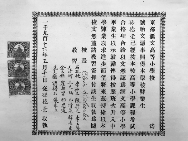 1916年5月22日京都汇文高等小学校校长克雷尔为孙敬修签发的毕业证书