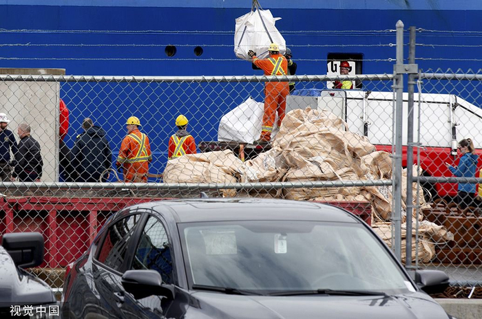 当地时间2023年6月28日,加拿大纽芬兰圣约翰,在加拿大海岸警卫队码头,从“泰坦尼克”号沉船附近的海底打捞的“泰坦”号潜水器残骸从“北极地平线”号船上卸下。