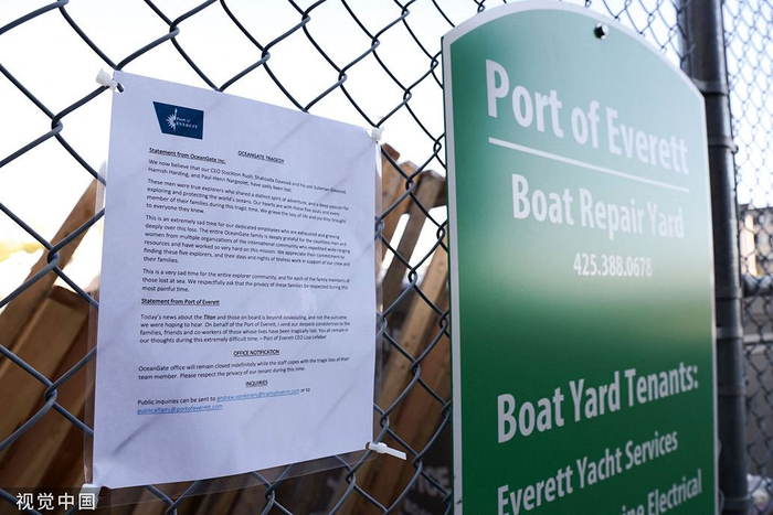 当地时间2023年6月22日,美国埃弗里特,“海洋之门”公司总部禁止进入,门口张贴了一份来自“海洋之门”和埃弗雷特港的声明。