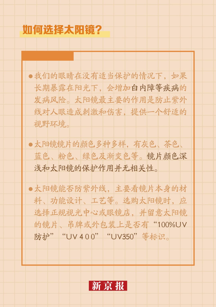 当然,选择一款能够有效防晒的墨镜也很重要。佩戴太阳镜,一方面是为了过滤紫外线,减轻紫外线对眼睛角膜、结膜、晶状体和视网膜的伤害;另一方面是为不用接受强光以及各种眩光照射,让眼睛有一个温和的视野环境。选错了太阳镜或者错误地使用太阳镜,都可能让眼睛反受其害。