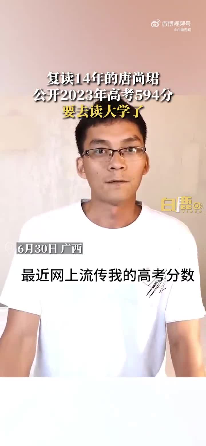 6月30日下午,已第15次参加高考的唐尚珺通过自己的社交账号发布视频称,今年他高考分数是594分,“读了17年的高中,今年也是决定去读大学了”;最近为填志愿的事苦恼,大概率会往师范类方向去选,“我个人认知有局限性,所以填志愿和选专业,我还是希望得到大家一些指点和帮助”。