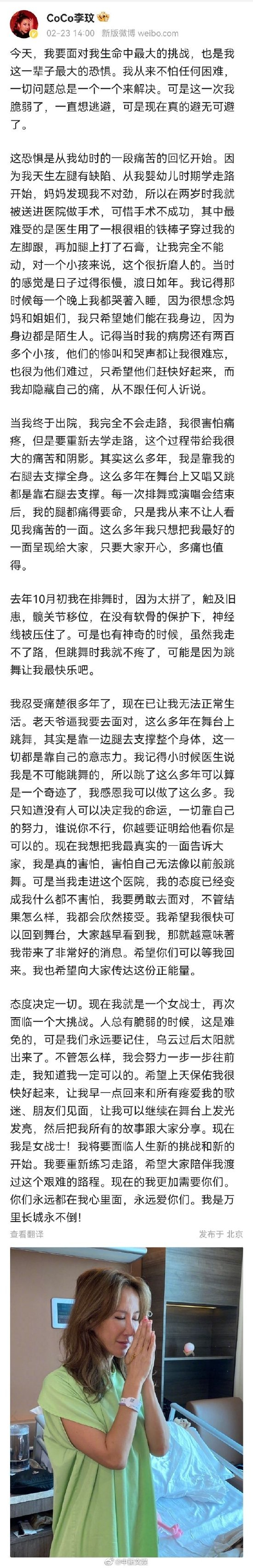 真的完全不敢相信,记得今年年初,coco还曾发长文透露自己天生左腿有缺陷,这么多年一直靠右腿支撑,做完骨盆及大腿的手术后,她说自己要像女战士一样重新学走路,“人总有脆弱的时候,这是难免的,可是我们永远要记住,乌云过后太阳就出来了。”当时二姐曾说,coco需要至少要休养6个月才能逐渐恢复元气。