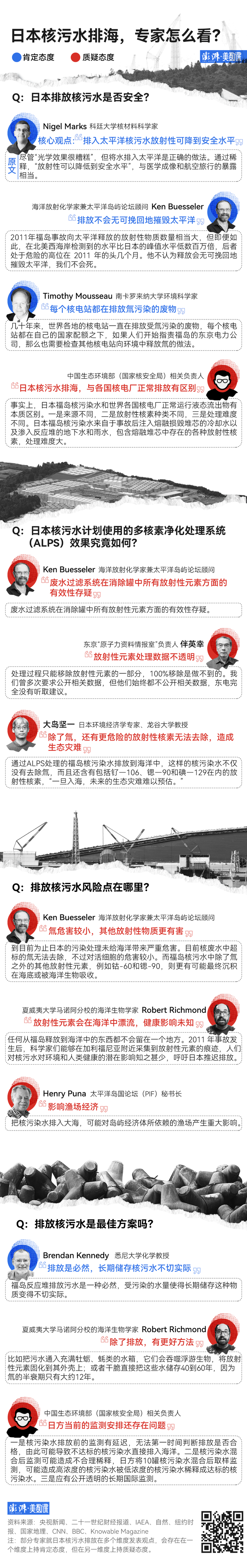 那么,日本核污染水入海究竟意味着什么?为什么外交部发言人会说 IAEA 的有关报告“未能充分反映所有参加评估工作各方专家的意见,有关结论未能获得各方专家一致认可”?澎湃新闻(www.thepaper.cn)整理了多位核污染处理专家的相关观点,从四个维度来观察潜在风险。
