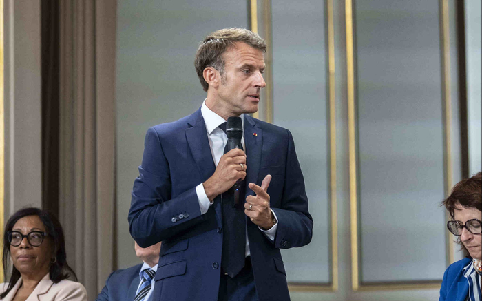 当地时间2023年7月4日,法国巴黎,法国总统马克龙在爱丽舍宫举行的一次会议上,向受暴力冲突影响的城市市长发表讲话。图/视觉中国