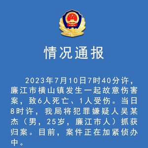 2023年7月10日7时40分许廉江市横山镇发生一起故意伤害案,致6人死亡、1人受伤。当日8时许,我局将犯罪嫌疑人吴某杰(男,25岁,廉江市人) 抓获归案。目前,案件正在加紧侦办中。