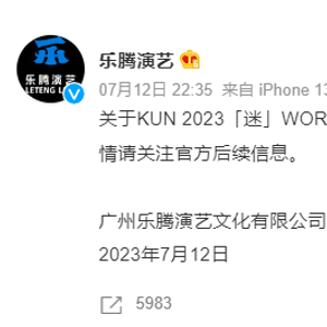 新京报讯 7月12日晚,广州乐腾演艺文化有限公司发布公告称,蔡徐坤KUN 2023「迷」WORLD TOUR-广州站的演出将延期举行。据悉,演唱会原定日期为8月2日。