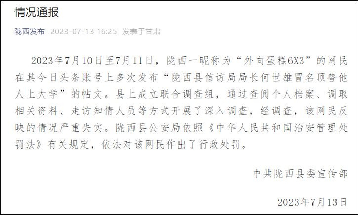 据甘肃省陇西县委宣传部微信公众号“陇西发布”7月13日消息,2023年7月10日至7月11日,陇西一昵称为“外向蛋糕6X3”的网民在其今日头条账号上多次发布“陇西县信访局局长何世雄冒名顶替他人上大学”的帖文。县上成立联合调查组,通过查阅个人档案、调取相关资料、走访知情人员等方式开展了深入调查,经调查,该网民反映的情况严重失实。陇西县公安局依照《中华人民共和国治安管理处罚法》有关规定,依法对该网民作出了行政处罚。
