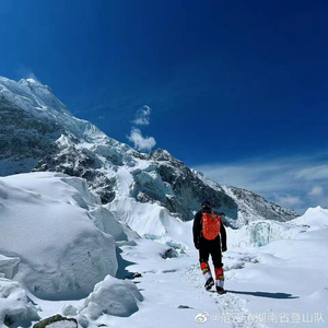范江涛是湖南省登山队领队。今年5月18日下午5点,已在珠峰南坡C4营地休息了一天的范江涛,和队友们一起朝着珠峰峰顶迈进。不出意外的话,他们将在第二天凌晨两三点钟登顶。当晚8点,他们来到了海拔8450米的位置。那是冰岩混合地带,坡度非常大,需要把安全绳固定在路绳上,一步步往上攀爬。