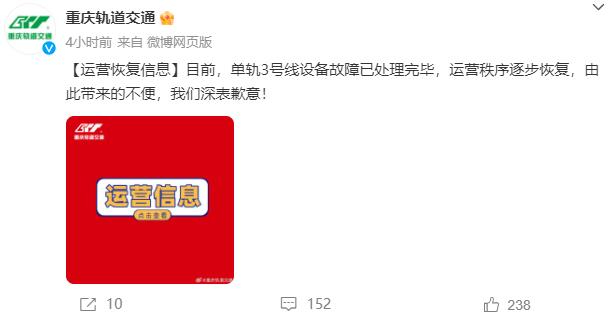 早上8时01分,重庆轨道交通官方微博号发布消息称,单轨3号线设备故障已处理完毕,运营秩序逐步恢复。