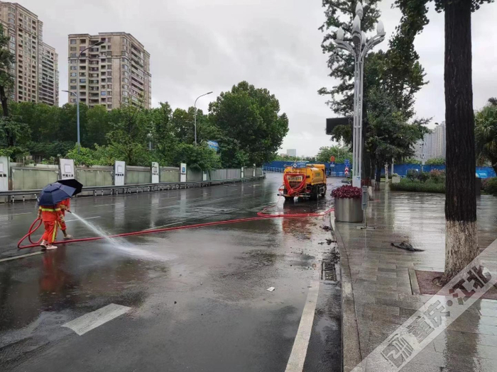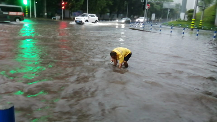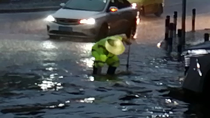 今天早晨6点,受强降雨影响,大剧院地铁站附近路面下水道无法及时排水,江北城街道组织人员疏通排水,确保上班高峰期人员、车辆安全。