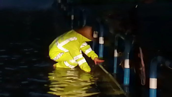 建新西路接嘉鸿大道匝道积水,江北交巡警渝澳勤务大队辅警及时清理堵塞排水口杂物,快速排除积水,保障交通畅通。