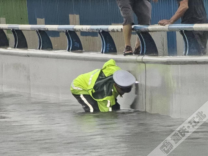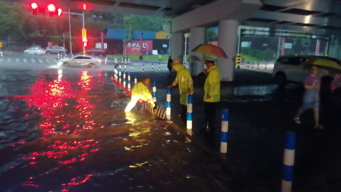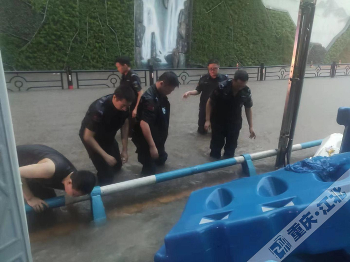 7月21日早高峰,重庆强降雨造成辖区部分路段积水严重,给居民出行带来不便。江北区交巡警支队勤务一大队民辅警在岗在位,积极作为,在南桥寺、盘溪路、壹江城、北滨一路等积水路段,清除污物疏通下水道,疏导被堵车辆,保障人民群众正常出行。