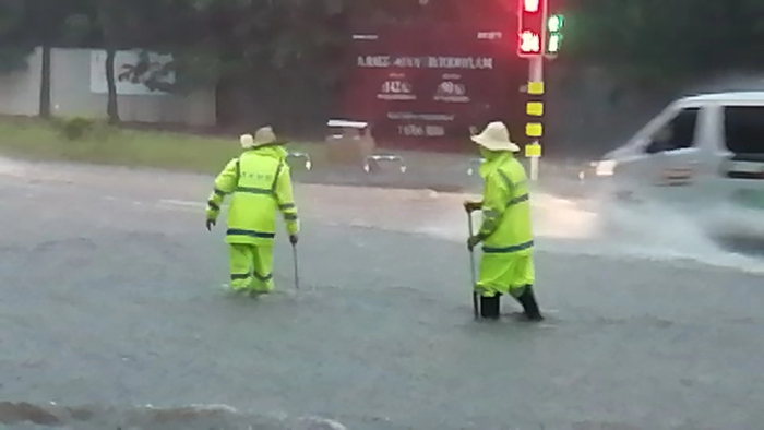 ▲抢险人员正冒雨疏通路段积水。受访者供图