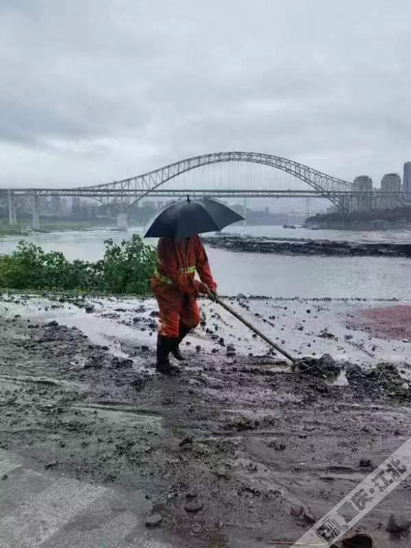 积水退去后,江北城街道组织力量清理道路、公园内的淤积泥沙和倒伏树木。