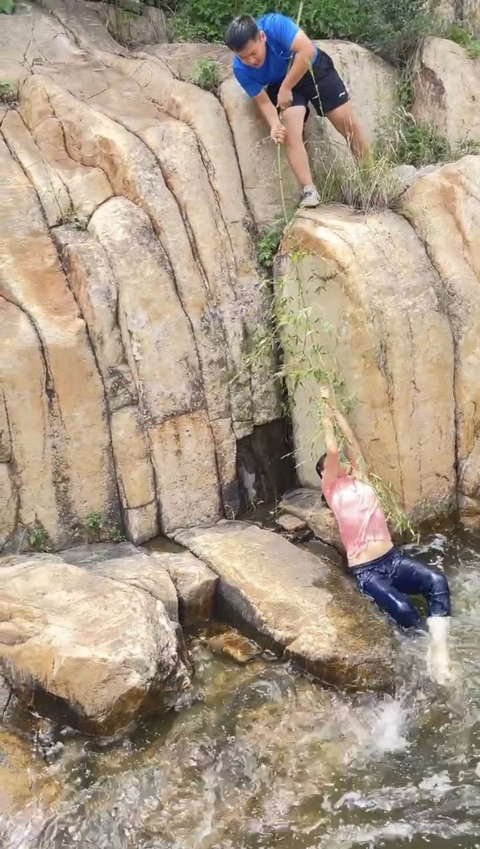 从视频中可以看出,水流已经没过女孩的腿部,到达腰部,她正双手按着岩石支撑身体。情急之下,李天龙一跃跳到河对岸,来到女孩附近,先观察寻找施救最好位置,同时接过另一名好心游客向他递来的一根带着较多竹叶的长竹竿。当他发现自己所站位置无法通过竹竿接触到女孩时,便再次寻找一个更易攀爬、水深更浅的位置,并将竹叶茂密一端递给女孩。女孩紧紧抓住竹竿,在李天龙的拉动下,终于被救到岸边。