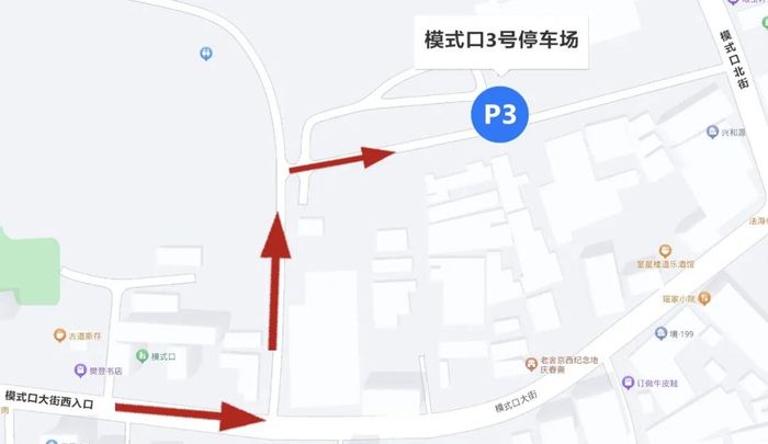 P3停车场位于模式口大街中段,附近景点有石景山区石刻文物园、古道斯存、樊登书店。