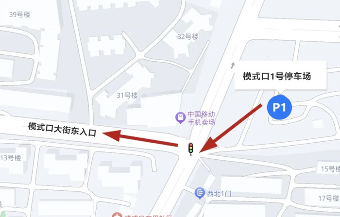 从模式口东口进入街区,您可以将车停在P1、P2停车场。