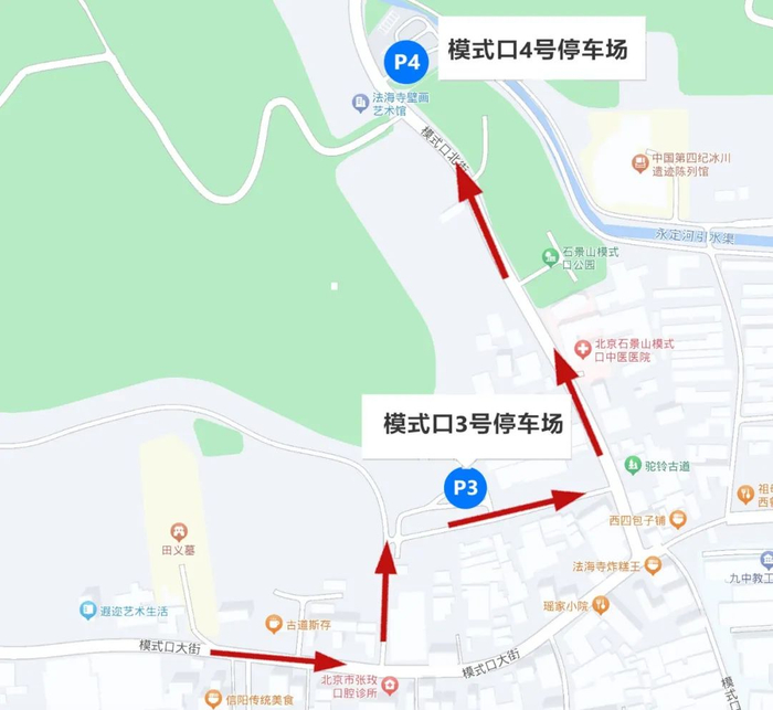 P4停车场是游逛法海寺壁画艺术馆,第四纪冰川遗迹陈列馆,法海寺最近的停车场。