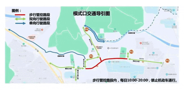模式口历史文化街区,一共有4个停车场,东西入口各2个,10:00-20:00,模式口大街步行街车辆禁行,请大家合理规划出行时间。