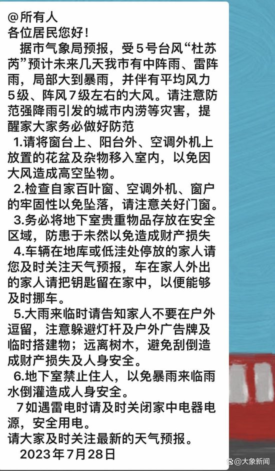 陈浩没有想到的是,计划因台风“杜苏芮”泡汤。他先注意到,28日,社区主任在业主群里发布通知,称根据气象预报,台风“杜苏芮”会导致未来几天持续降雨,并有7级左右大风。紧接着,孩子所在的幼儿园也发了类似通知。再上网一搜,才知道“杜苏芮”的厉害,比如福建夏门,商家纷纷给门窗玻璃粘上胶带备战台风,“整条街上的胶带都脱销了。”