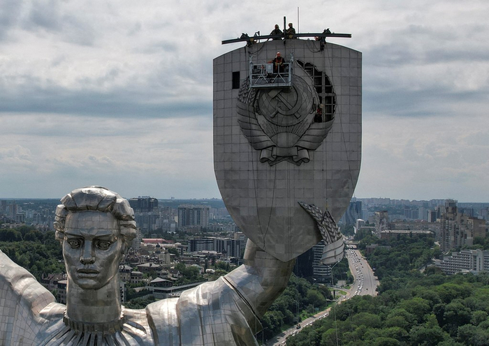乌媒:基辅开始拆除“祖国母亲”雕像的苏联国徽,用乌克兰三叉戟替代