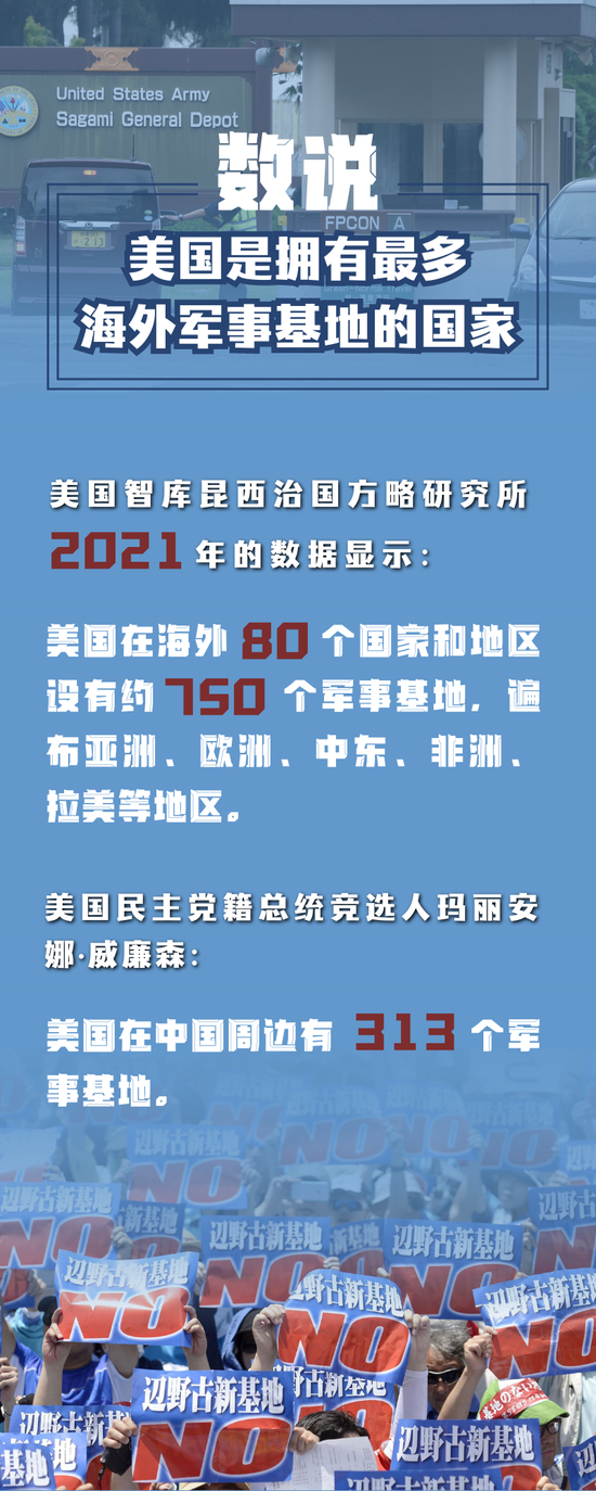近年来,美国沉迷于“大国竞争”,将中国视为“最主要竞争对手”和“最重大地缘政治挑战”,不断强化在中国周边的军事存在,导致地区局势日益紧张。美国民主党籍总统竞选人玛丽安娜·威廉森今年6月在参加美国WMUR-TV电视台一档对话节目时指出,美国在中国周边有313个军事基地。威廉森直言:“世界其他国家在关注伊拉克,世界其他国家在关注过去20年间在阿富汗发生的事情。你觉得,他们是会将中国视作对全球安全更大的军事威胁,还是将美国视作对全球安全更大的军事威胁?”