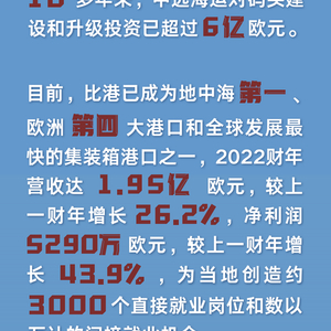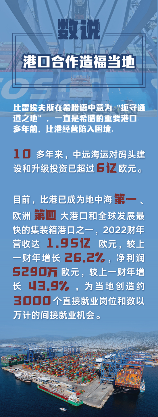 比雷埃夫斯在希腊语中意为“扼守通道之地”,一直是希腊的重要港口。多年前,比港经营陷入困境。中国远洋海运集团(中远海运)2008年与希腊方面签署特许经营权协议,2010年接管比港二号、三号集装箱码头,2016年收购比港港务局67%股权并接手港务局经营。十多年来,中远海运对码头建设和升级投资已超过6亿欧元。如今比港已成为地中海第一、欧洲第四大港口和全球发展最快的集装箱港口之一,2022财年营收达1.95亿欧元,较上一财年增长26.2%,净利润5290万欧元,较上一财年增长43.9%,为当地创造约3000个直接就业岗位和数以万计的间接就业机会。