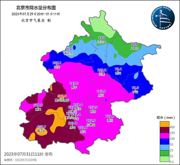 29日夜间开始北京地区出现暴雨到大暴雨,西南部特大暴雨。市气象台发布29日20时至31日11时降水量(毫米):全市平均164.7,城区平均(朝,海,丰,石,东,西)181.3,西南(门,房)328.6,东南(通,大)138.7,西北(延,昌)125.0,东北(密,顺,平,怀)73.1;城区最大丰台千灵山493.2,全市最大门头沟高山玫瑰园580.9,最大小时降水强度丰台千灵山111.8毫米/小时(31日10时-11时)。