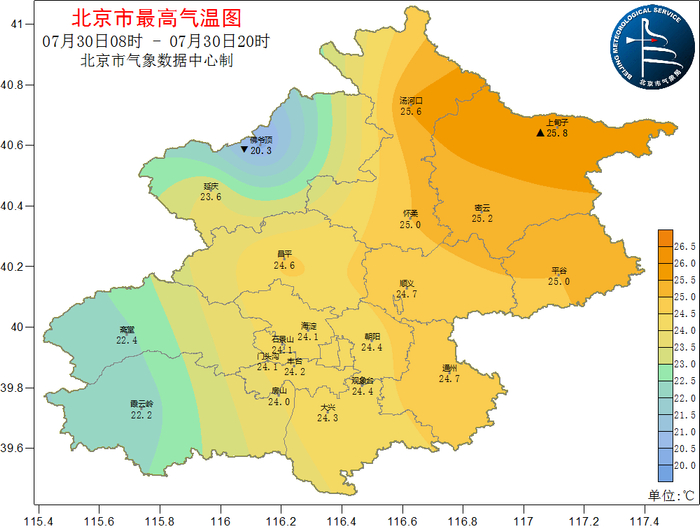 8月1日白天(周二):阴有小雨;东转南风2、3级;平原地区最高气温30℃,山区最高气温25~27℃;最小相对湿度90%。