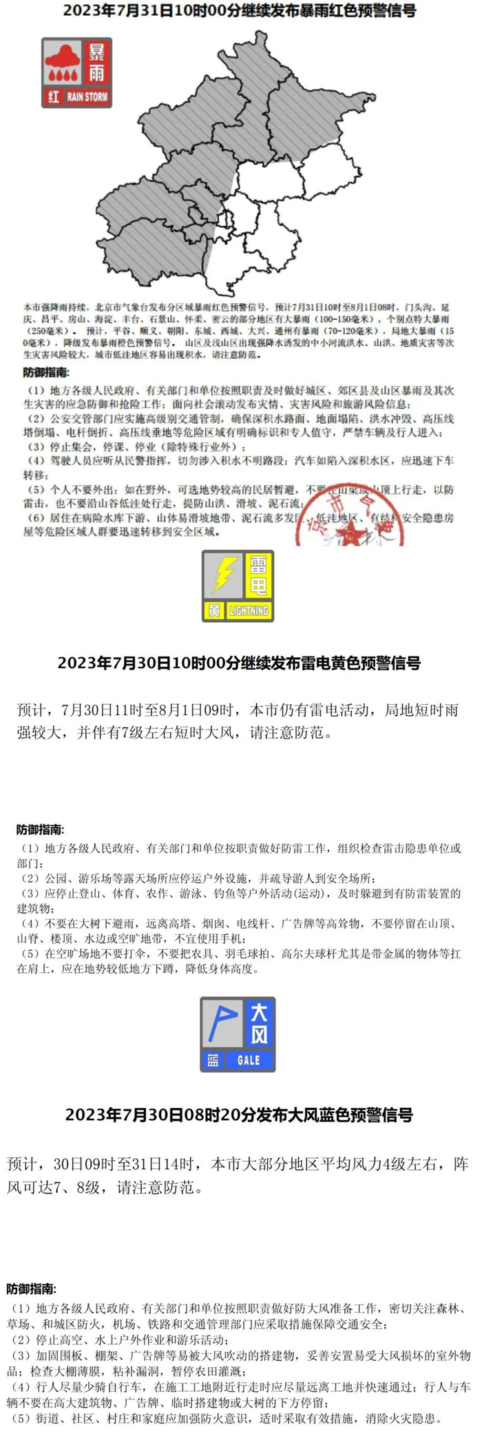 1、今明两天降雨持续,暴雨红色预警、大风蓝色预警及雷电黄色预警中,户外出行注意防风防雨防雷电;远离室外高空危险物,如建筑装饰物、广告牌和高大树木等,注意安全。