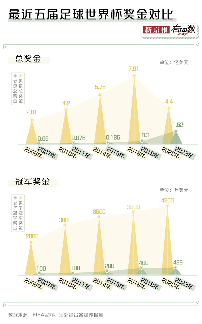 还是以世界杯为例。女足世界杯的奖金制度兴起于2007年。但不管从奖金总额,还是冠军奖金来对比,都跟男足有着天壤之别。