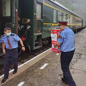 铁路部门为滞留列车上的旅客配送必要的生活物资。中国铁路北京局供图