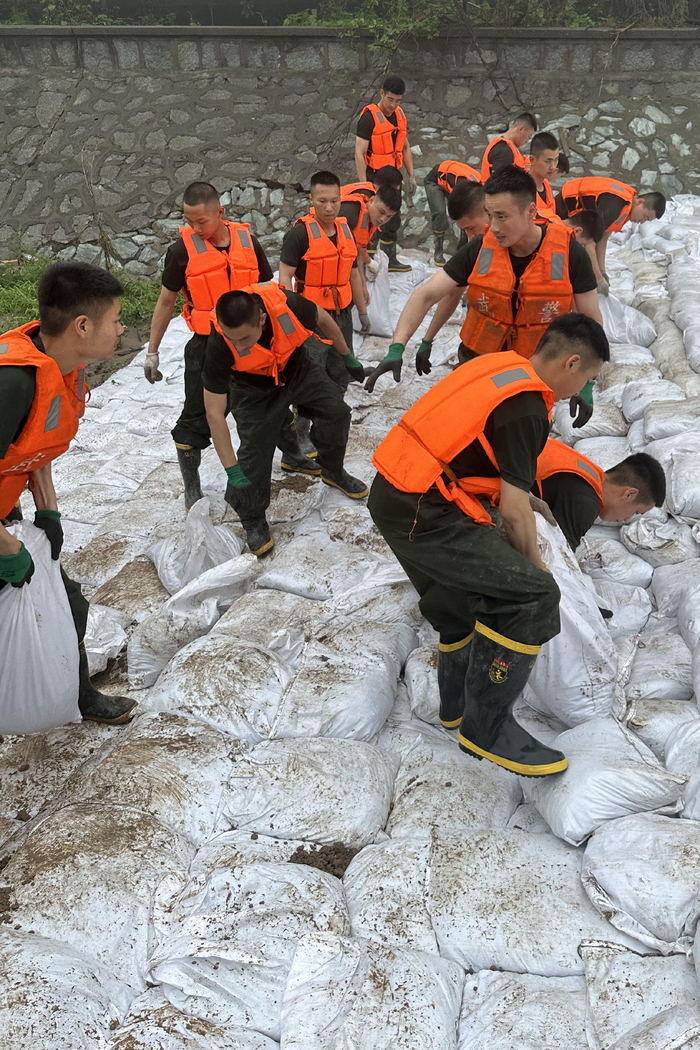 受特大暴雨影响,2023年7月31日下午,永定河上游北京段已率先出现较大洪水。为确保了洪峰顺利通过永定河,武警北京总队已动用兵力600余人次,车辆10台,连夜奋战15小时,装填搬运沙袋1.8万余个,筑堤坝长50余米、宽8米、高3米。