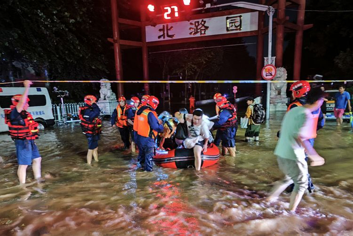 消防队员抱着老人离开积水区。