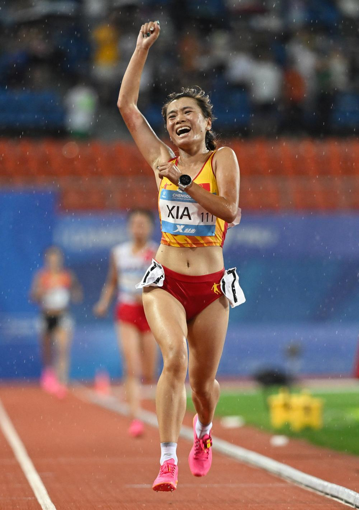 成都大运会田径女子10000米决赛进入到最后一圈,身处第一集团的中国选手夏雨雨开始提速,在全场观众的助威声中,她第一个冲过终点线,夺得冠军。这位来自清华大学的姑娘说:“在我冲线的时刻,天空下起了雨,我的名字里面也有‘雨’,今天是个幸运的日子。”
