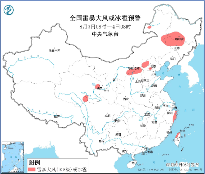 预计8月3日08时至4日08时,内蒙古河套地区和东北部、黑龙江南部、吉林中西部、青海东部、陕西北部、山西北部、河北北部、浙江东部、台湾岛北部等地的部分地区将有8-10级雷暴大风或冰雹天气,局地风力可达11-12级,并可能出现龙卷;