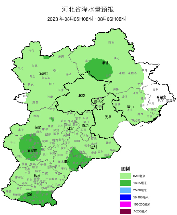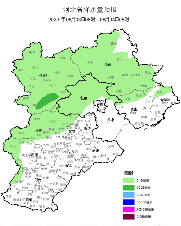 今天白天到夜间,张家口、承德、唐山北部、秦皇岛北部、保定西北部和石家庄、邢台两个地区的西部山区多云间阴有分散性雷阵雨或阵雨,局地有中到大雨,雷雨时局地伴有短时强降水、短时大风等强对流天气,其他地区晴间多云。最高温度,张家口北部、承德东部、唐山南部30~32℃,其他地区33~36℃。最低温度,张家口北部、承德北部、保定西北部18~23℃,其他地区24~28℃。