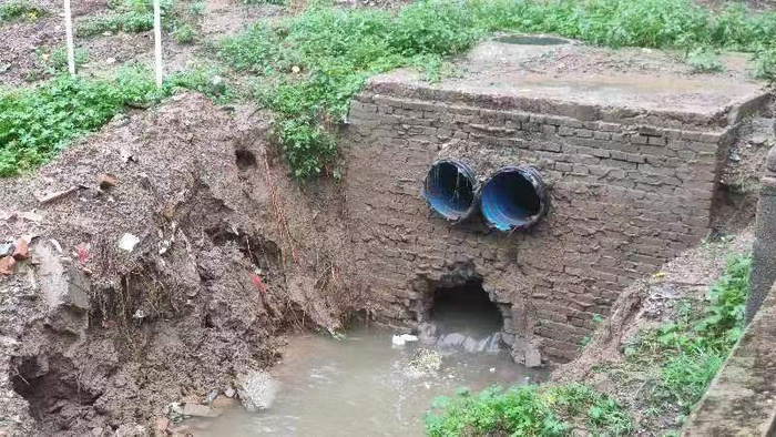 小龙河就位于绿茵花园西区南侧,居民们说,小龙河以前是一条干河,但如今受连续降雨影响,现在水深已有1米多,水面宽10余米。站在桥北,记者看到堤岸上部有两个圆形管道,管道口下方有一个新挖的大洞,湍急的水流正从洞口源源不断地排入小龙河,桥头旁还设有一个蓝底白字的告知牌,上面写着“城市雨洪排口”。“上面这两根排水管较细,位置也高,如果使用这两根排水管排水,恐怕整个小区都淹了,所以小区物业凿开了下面这个排水口。”聂先生说。
