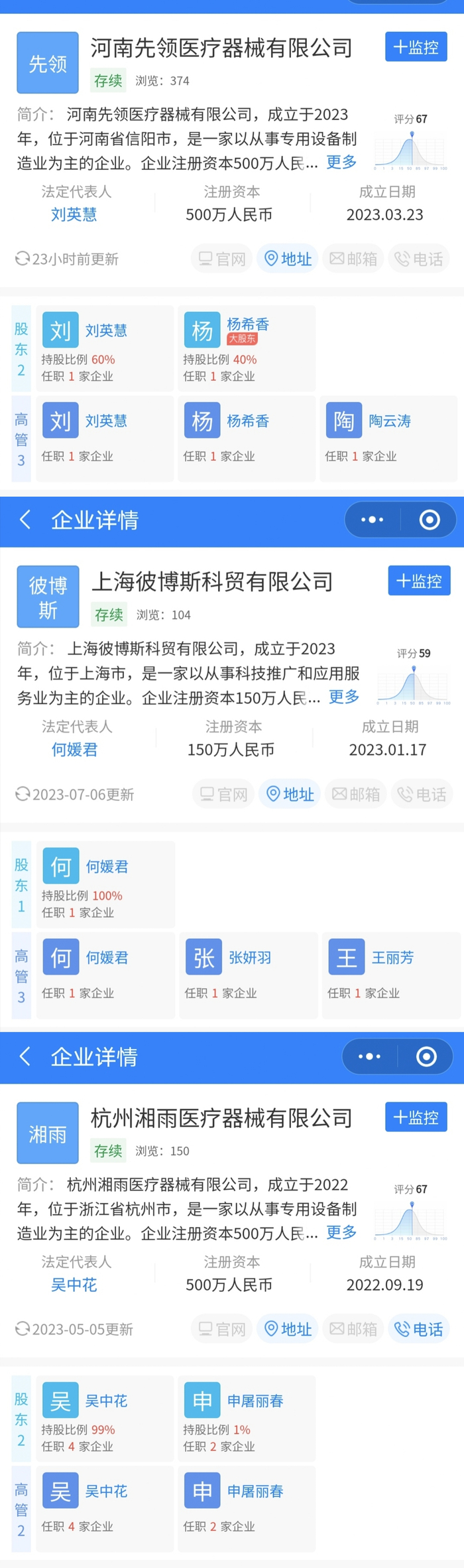 另外一家杭州湘雨医疗器械有限公司,成立于2022年9月,今年7月便中标了长春市传染病医院第一方舱医院升级项目124.6万元标的。企查查信息进一步显示,法定代表人吴中花旗下的杭州江汐医疗器械有限公司成立于去年8月,已在去年11月中标了扎赉特旗卫健委一份134.56万元的“新冠疫情防控物资采购”标的,这份合同的公告日期为今年7月28日。