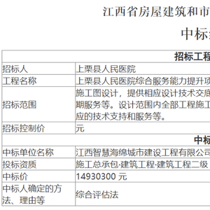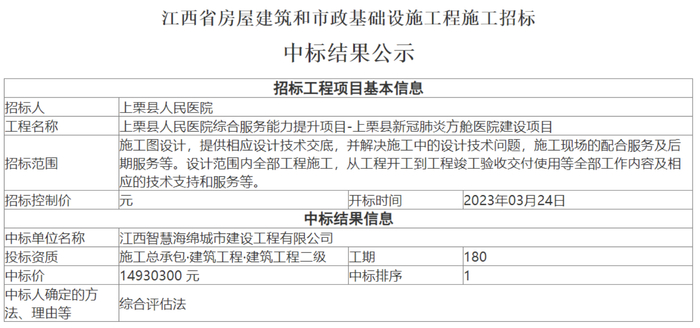 更早一点,今年3月24日,江西智慧海绵城市建设工程有限公司中标了江西省上栗县人民医院新冠肺炎方舱医院建设项目,公告显示,项目建筑面积3765平方米,项目资金来源为财政和自筹,中标价格为1493.03万元。