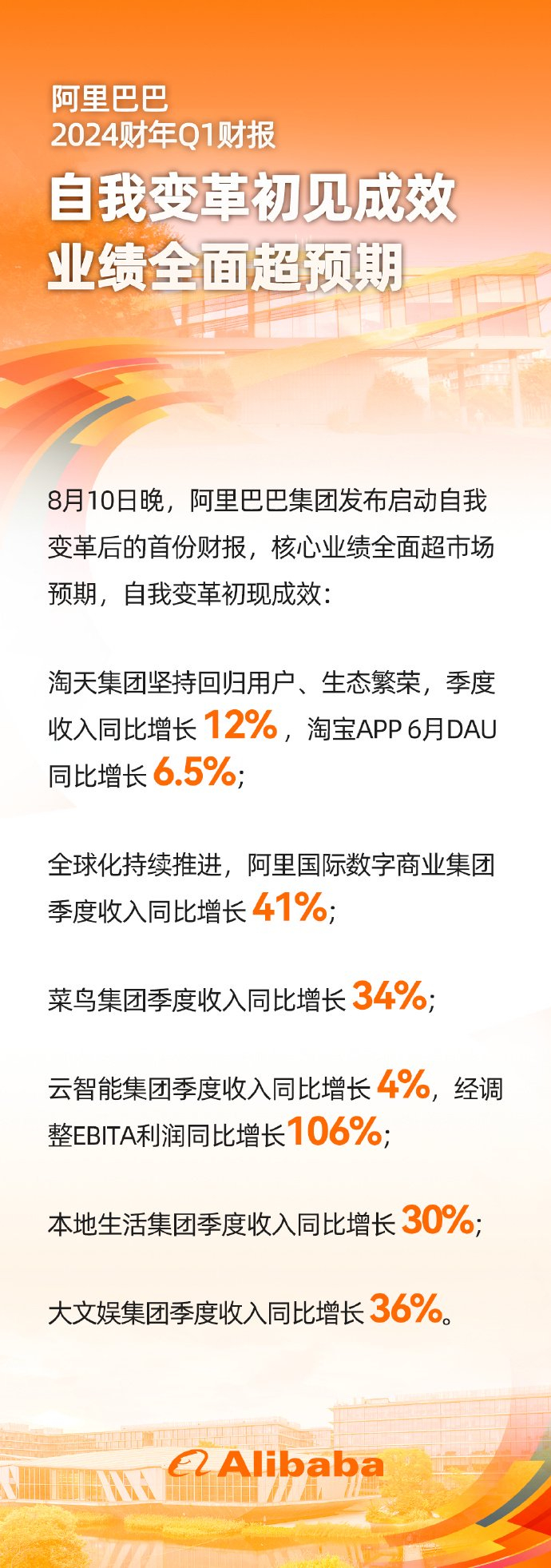 8月10日晚,阿里巴巴发布2024财年第一季度财报,这是组织变革后的首份季度业绩。